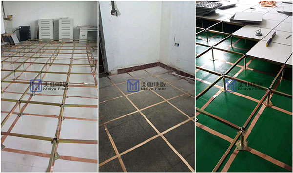 没有特别高的工程等级要求下,在防静电地板的外圈支撑脚围一圈铜皮然后接入到户外地下防雷接地。静电地板的支撑脚用铁丝或者铜线连接即可。